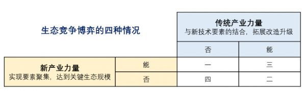 基于以上分析,我们可以看到这样的生态博弈格局:对传统产业力量来说,核心的挑战是能否实现与新技术要素的结合,找到拓展、改造、升级的空间;对新产业力量来说,核心的挑战是如何迅速实现要素的聚集和进化,壮大自己阵营,侵蚀对手链条,达到关键生态规模,形成生态竞争力(Adner,2016)。