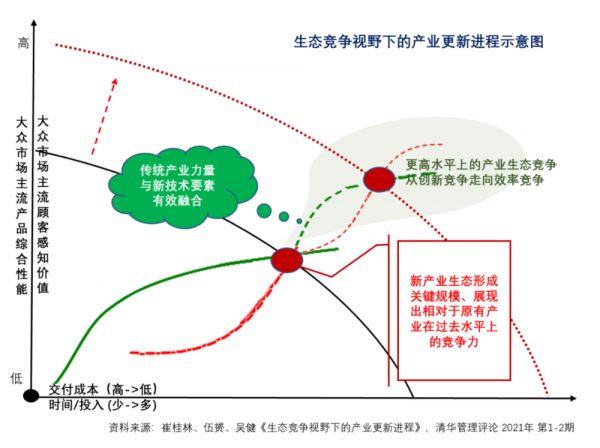 情况三,新产业力量达到关键生态要素的聚集规模,展现出了强大的竞争力;与此同时,传统产业力量亦在学习转型中,实现自我超越。那么,产业生态竞争将更加激烈,从创新竞争走向能力构筑竞争(藤本隆宏,2007),即效率竞争,产业在更高水平上走上精益进程,不同生态的领军者需要巩固其在各自体系中的优势地位。
