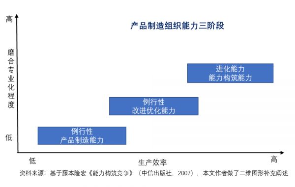 按照他的理论,产品制造组织能力分成:1. 例行性的产品制造;2. 例行性的改进优化;3、进化性质的创发演化,只有第三点才能称之为“能力构筑能力”,即顾客感知不到的精益效率(相对照,本文生态竞争框架的纵轴强调的是顾客可感知的价值)。