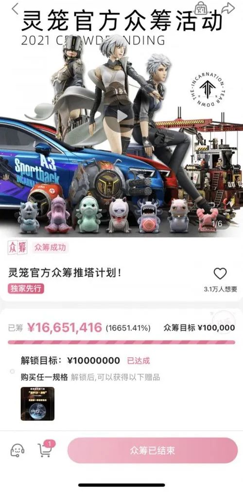 随后B站与中国潮玩品牌DODOWO双方合作推出“蔬菜精灵”盲盒,众筹在会员购里上架,众筹金额18天便已突破 1000 万元,直到今年2月28 日众筹结束,共计卖出25万只,累计金额超1390万元。