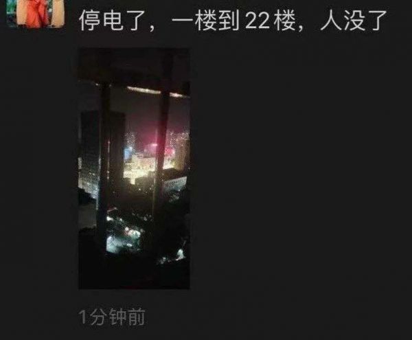 另一个说法似乎更有说服力: B站大楼停电 。 伴随这个消息出现的是一张B站员工的朋友圈截图,这则朋友圈不仅提到了停电,还配上了照片,同时另一张截图似乎也印证了这个事实: 一位B站主播的粉丝群里,一个自称家在B站大楼对面的网友po出照片,声称“真的停电了”。