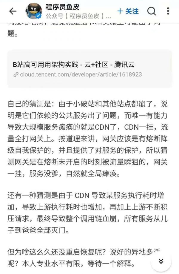 与此同时,微博与知乎上的众多相关人士从专业角度进行了分析,有人认为是B站依赖的公共服务出了问题; 也有人对B站的“容灾备份系统拉垮”“应急方案不周全”进行了吐槽; 还有“技术大佬”从B站的网站及App的整体架构进行了分析,从技术角度详细列举了各种说法的可能性; 而豆瓣、A站等App的崩溃也让整个讨论进一步升级。