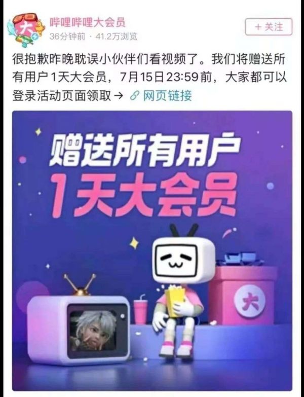 B站崩后,要送1天会员?