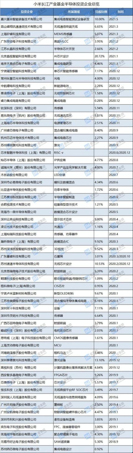 据不完全统计,在小米产投的100多家企业中,有50多家是半导体企业,比肩华为的哈勃科技在芯片领域的投入力度。