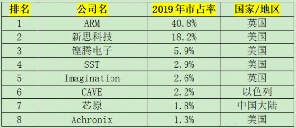在芯片IP市场,英国的ARM是绝对的王者,2019年市占率达到了40.8%,芯原虽然是中国大陆中排名最靠前的,但也只有1.8%的市占率。