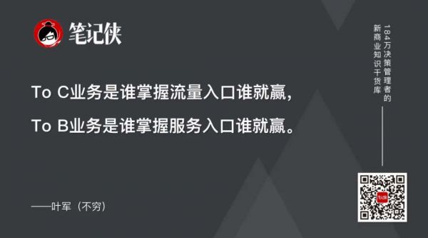 平台应该要让你的生态、合作方变得更伟大,这是平台的特性,特别是 To B 这个领域非常明显。To B业务天生以企业为中心,不是薅别人流量,To C业务是谁掌握流量入口谁就赢,To B业务是谁掌握服务入口谁就赢。