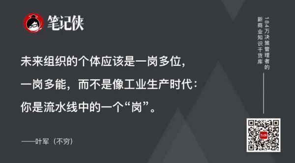 所以我们认为未来组织的个体应该是一岗多位,一岗多能,而不是像工业生产时代:你是流水线中的一个“岗”。