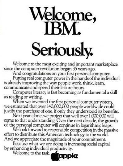 苹果当时在公关方面做得比其他任何公司都要好得多,它在《华尔街日报》上刊登了一整版广告说:“欢迎 IBM。真的。” 就像苹果的众多广告一样,这是一篇修辞的杰作,设法让你听起来感觉很亲切,同时也明确表示 a)IBM 是后来者;b)苹果打算把IBM看作是同行,仅此而已。