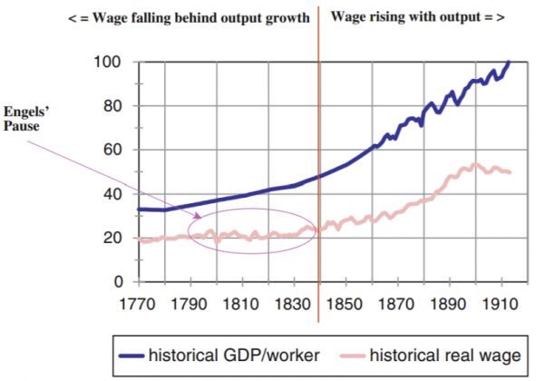 技术变革可以迅速推动经济增长,但并不能立即带来社会工资水平的提高。美国经济史学家Robert Allen(2009)研究发现,英国工业革命一经发生,人均GDP就得到大幅提升,但工资水平在长达半个世纪的时间里几乎没有增长。Allen把这种现象命名为“恩格斯停滞(Engels’ Pause)”。直到1840年之后,英国的工资水平才开始大幅提高,从而呈现出与人均GDP同步增长的趋势。如下图所示。