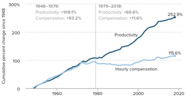 当下的情况似乎也是这样。上世纪80年代至今,数字革命孕育兴起。1979~2018年,美国生产率提高了69.6%,而平均时薪只提高了11.6%,看上去是陷入了“恩格斯停滞”。而在此前的30年时间,生产率和时薪几乎同步增长。如下图所示。