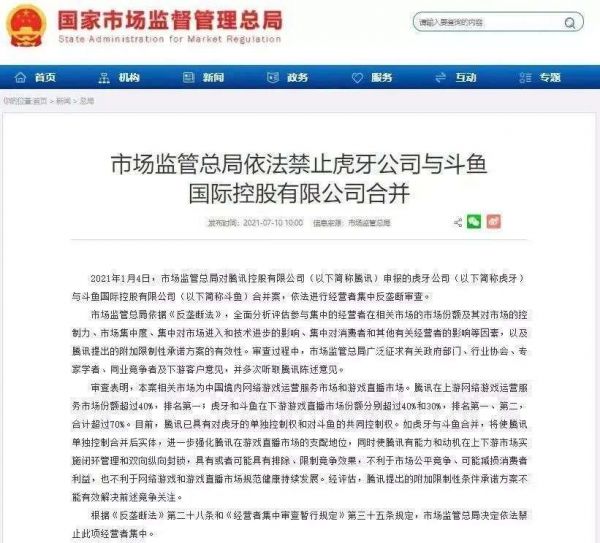 近日,市场监管总局宣布依法禁止虎牙与斗鱼合并,宣告了中国直播的两极“和亲”尝试正式失败,有人调侃道:这是婚前检查没有通过啊。事实上,虎牙和斗鱼的合并只差临门一脚,只要国家相关部门点头就能够进入到合并快车道,毕竟两家公司的背后都是腾讯,一家人不说两家话。