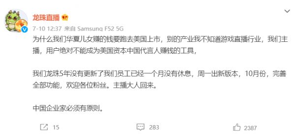 在市场监管总局阻止虎牙斗鱼合并后,龙珠直播突然原地复活,并且在微博账号连发了四十多条微博,直呼国家救了自己一命,并且宣布龙珠直播归来的消息。根据微博查到的记录,在7月10日复活前,最后一条微博的时间是2020年6月15日,抽出了四名用户的奖品后就再无动静,点赞、评论的人数也是仅有两位数,可以说当时的龙珠直播已经处于“凉了,但没有完全凉的状态”中。