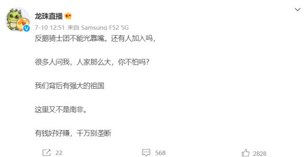 当龙珠直播在7月10日发布“复活”微博后,顿时引来了不少网友的围观,而在第一条微博下,点赞量最高的留言就是“还以为倒闭了”,而龙珠直播则回复“他们倒了,我们也不会”。从7月10日开始,龙珠直播就一直高频率更新微博,并且在微博中将矛头直指斗鱼和虎牙背后的腾讯,指责对方垄断市场,禁止龙珠直播的主播直播LOL等游戏。