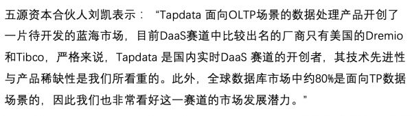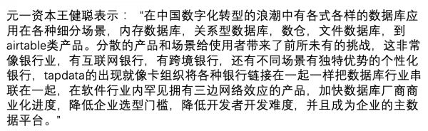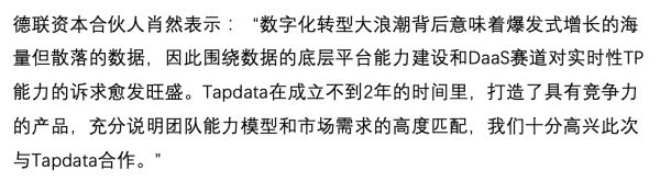 36氪了解到的「Tapdata」成立于2019年9月的,聚焦在数据即服务(Real Time DaaS)赛道,针对企业运营中的TP业务以毫秒级响应速度提供实时数据平台服务。