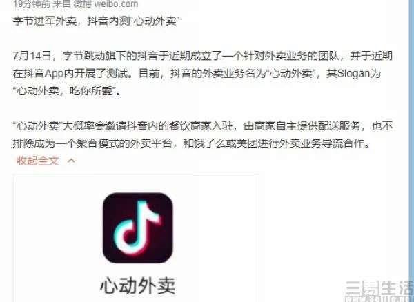 本月初,阿里方面将基于地理位置服务的三大业务,即高德、本地生活服务和飞猪组成生活服务板块,由俞永福掌舵,被外界认为或是将全面升级与美团的本地生活服务之战。但就在这两大巨头激战正酣之时,斜刺里杀出了个字节跳动。近日据Tech星球的独家爆料显示,抖音方面于近期组建了外卖业务“心动外卖”,并已开始在抖音APP内部开启小范围测试。