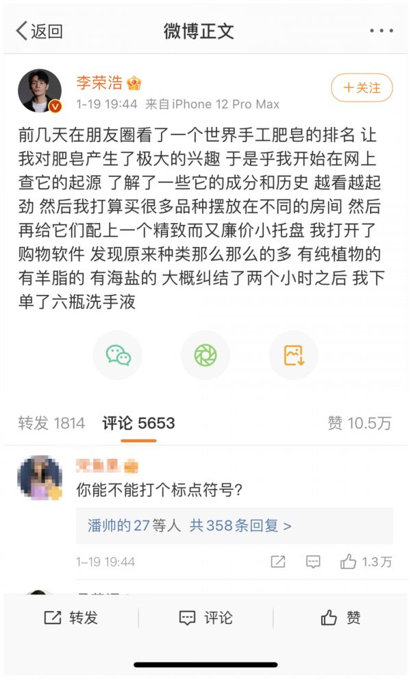 李荣浩常常因为不打标点符号而被粉丝吐槽。图片来源:微博@李荣浩