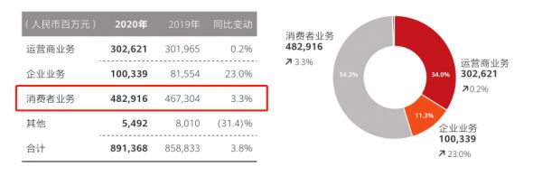 根据华为2020年的年报,华为所有业务收入8913亿元,增速仅为3.8%。其中消费者业务收入4829亿元,增速从2019年的34%骤降到3.3%,增长动能几乎断崖。
