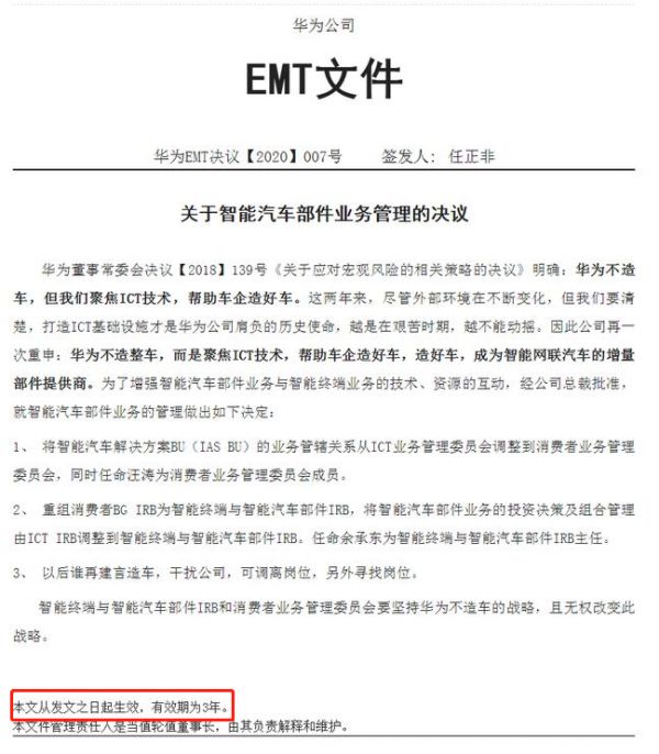 华为一直重申“不造车”,暗示着华为要做车企的“朋友”而不是“竞争对手”,解除众多车企的防范心理,吸引更多的朋友。然而,在文件的末尾,又写着“本文从发文之日起生效,有效期为3年”。