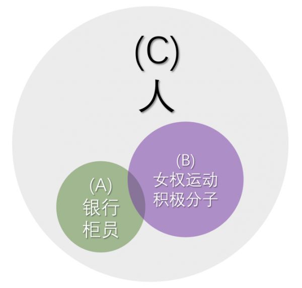 “琳达问题” 则涉及概念的刻画方式。概率论的通常用法是把一个概念看成一个集合,比如 “银行柜员” A和 “女权运动积极分子” B都是 “人” 这个集合C的子集,而 “琳达” (作为一个人)属于A或B的概率分别是A和B相对于C的大小。“是银行柜员又是女权运动积极分子的人” (下图中的深紫色部分)显然是 A 和 B 的公共子集,因此 “琳达” 在其中的概率不可能大于在A中的概率。