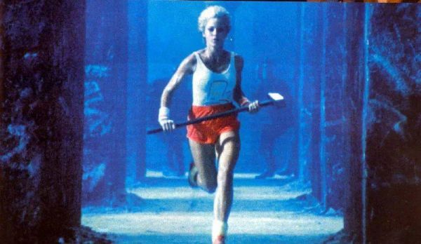 这时,有一个穿着白T恤、红短裤的年轻女子拿着一个铁锤跑进会场,像掷标枪那样把铁锤奋力掷向屏幕,屏幕粉粹了,“老大哥”不见了。画面渐渐隐去,出现以下字样,配画外音:“1月24日,苹果电脑公司将推出麦金塔(Macintosh)。你会明白为什么1984年不会像《1984》。”