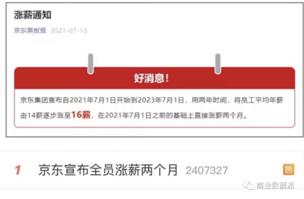 7月13日,京东通过官方公众号“京东黑板报”发布《涨薪通知》,宣布“自2021年7月1日开始到2023年7月1日,用两年时间将员工平均年薪由14薪逐步涨至16薪,在2021年7月1日的基础上直接涨薪两个月”的消息。