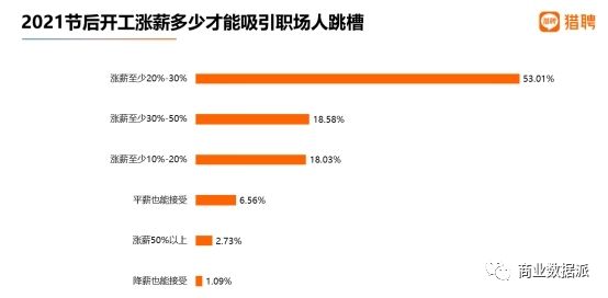 据猎聘发布的《2021春节后开工一周中高端人才就业数据报告》显示,59.4%的人跳槽是为了“赚更多的钱”。但跳槽就能涨薪吗?工作近5年的周明告诉《商业数据派》:“太难了。”