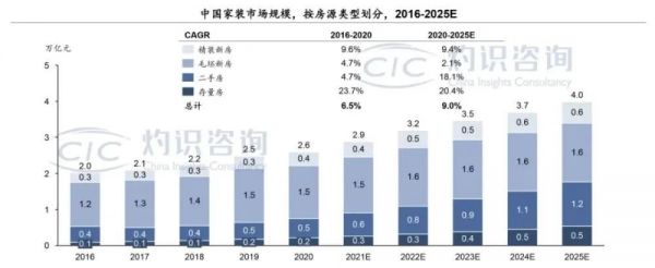 据灼识咨询《2021中国互联网家装行业蓝皮书》,2020年我国家装市场总规模达到2.6万亿元,2016-2020年中国家装市场规模年均复合增长率为6.5%,预计2020-2025年该增速将提升至9.0%,这意味着家装行业仍然是一个向上的“半朝阳”产业。