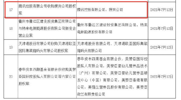 7月13日,国家市场监管总局披露,腾讯收购搜狗股权案已获无条件批准。当日,搜狗股价上涨2.3%,搜狐股价上涨27.58%,腾讯上涨3.93%。