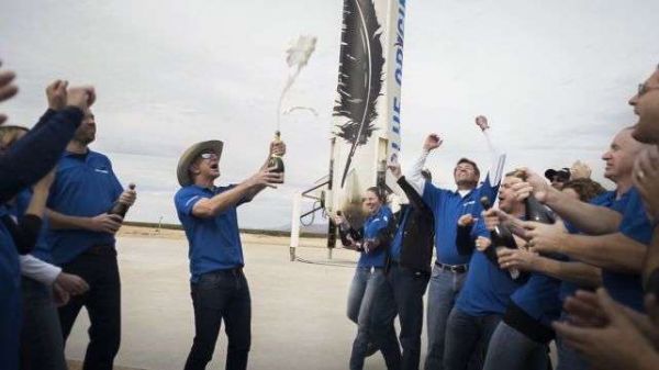 贝索斯和蓝色起源工作人员在一次发射成功后进行庆祝
