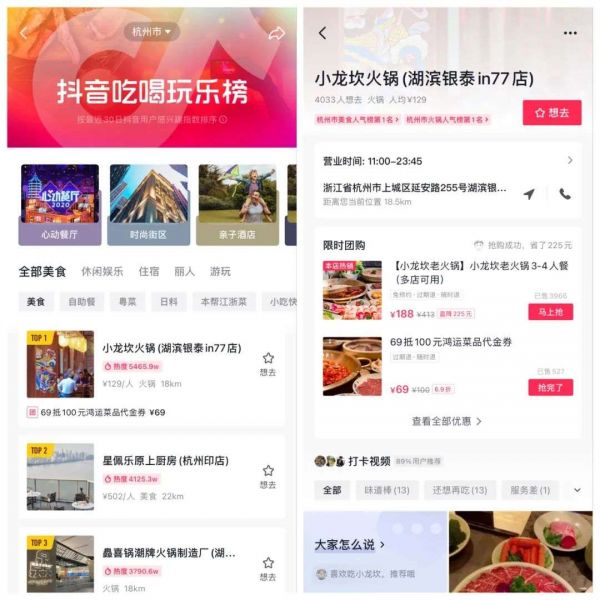 另外,抖音2020还上线了心动餐厅的榜单,用户也可以直接进行团购。