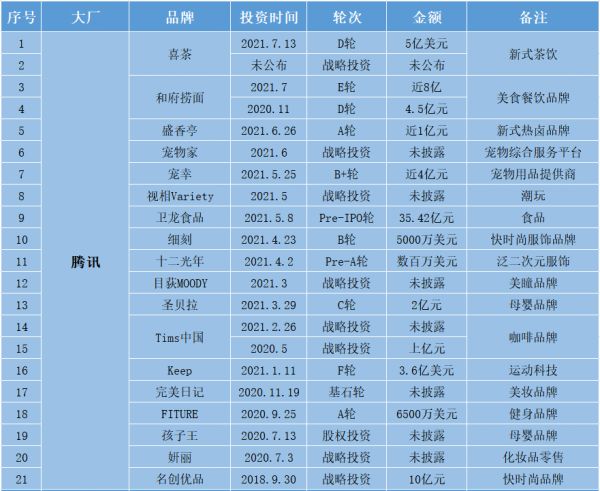 盒饭财经根据天眼查、it桔子等公开数据不完全统计,腾讯近3年至少累计在新消费领域投资16笔,今年上半年投资13起,已披露的金额累计超过130亿人民币。