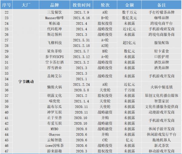 盒饭财经不完全统计,从2020年至今,字节跳动在新消费领域至少投资了23家,其中仅在今年上半年,就投资了15家,是去年一年的2倍。