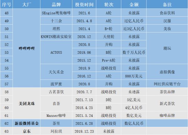 仅在今年上半年,据盒饭财经不完全统计,腾讯、字节跳动、哔哩哔哩、美团、京东、新浪微博6家互联网大厂,在新消费领域的投资已经超过35起。