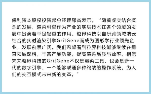 粒界科技2015年成立,其创始人及CEO吴小毛博士毕业于上海交通大学计算机系,他带领的国际化团队来自18个国家和地区。此次粒界科技获得保利资本与无锡金融创投集团联合领投,得益于前期与他们的战略合作与业务沉淀。除了继续在智慧城市管理、数字内容创作上共同探索之外,投资人们也将目光放在了未来混合现实内容的创作上来。吴博士表示:这次的投资对于我们推动GritGene引擎在数字化管理的发展上有很大的推动作用。