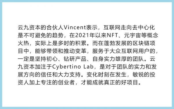 36氪获悉,近日区块链技术公司Cybertino Lab获千万美元天使轮融资,本轮融资由云九资本领投,渶策资本、万物资本、UpHonest、Hashed、Animoca Brands、Divergence、Draper Dragon等知名投资机构跟投。融资将用于团队扩张、产品研发。