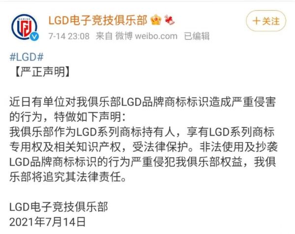 LGD电子竞技俱乐部也在之后发布了维权声明,对ZGDX电子竞技俱乐部品牌商标侵权事件进行回应。