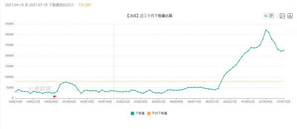 此前,《平安京》的下载量排名一直处在一种尴尬的位置,只有在大型活动期间才会在畅销榜上见到它的姓名。 根据“七麦数据”的预估,《决战! 平安京》的下载量在6月23号之后开始了一波较大的增长,并在7月9日达到了近两年来的最高点。 部分玩家认为是由于联动活动“三丽鸥家族”带来的引流,但从数据来看,这样的理由显然站不住脚: 三丽鸥家族并不具备这样的流量热度。