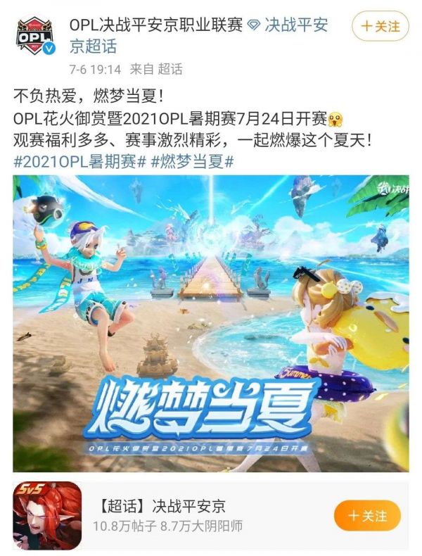 7月14日官宣ZGDX战队加入OPL职业联赛后,相关话题迅速在各大社区中登上热榜,顺势也带动了对OPL即将到来的“暑期赛”的传播。 OPL官博在随后发布了2021暑期赛开赛日的售票消息——开赛日,《平安京》电竞代言人许凯也将亮相现场,与OPL明星选手们同台对抗。