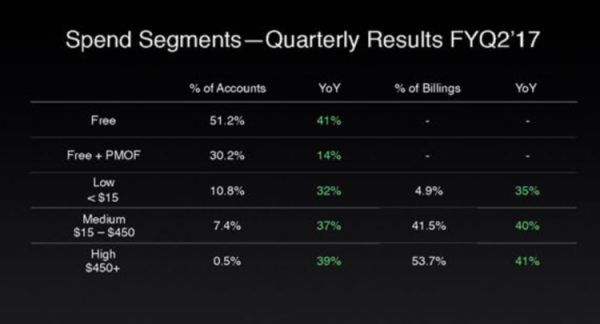 也就是说,收入主要来自游戏,而且从其他的披露来看,超过 90% 是免费游戏。从前十大发行商可以体现出这一点。但也反映在这样一个事实上,也就是仅 0.5% 的用户贡献了超过一半的收入。如果这些比例保持不变的话,那么去年苹果从约 500 万人当中赚取了 70到80 亿美元的佣金收入,这些人每季度在游戏的应用内购买中的花费超过 450 美元。苹果已经开始大谈特谈怎么帮助你用更健康的方式去使用 iPhone,但这似乎并没有延伸到应用商店上。