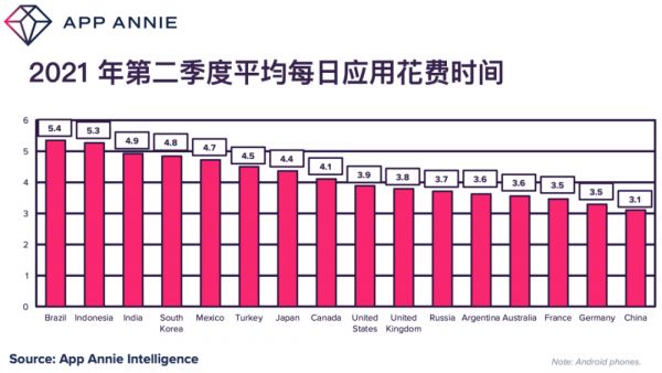 截至 2021 年第二季度,两年内欧洲、中东和非洲主要国家/地区的消费者在应用上花费的时间增加了约 30% 或更多。然而总体来说,这些国家的花费时长平均值排名较为靠后。例如,法国和德国的消费者现在每天花在应用上的时间只有三个多小时。这使它们在 App Annie 研究跟踪的 16 个地区中分别排在第 14 和第 15 位。