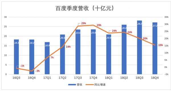 北京时间2019年2月22日晨,百度发布了2018年Q4未经审计财报。报告显示,2018年Q4营收272亿,同比增长15.4%(若剔除增值税计算方式变更因素,2018年Q4营收同比增长22.3%)。2018财年,百度营收1022.8亿,首次突破1000亿,较2017财年增加20.6%。