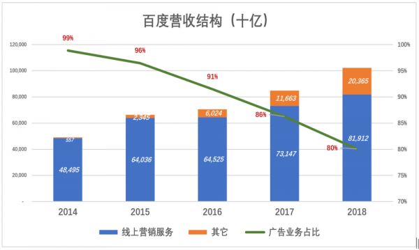 百度正在逐步改变收入来源单一的境况,2019年广告收入占比大概率降至80%以下。