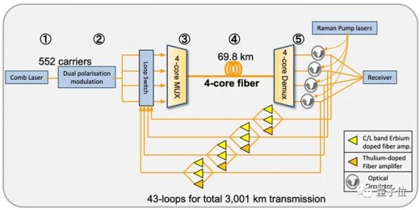 系统由一个梳状激光器发射多个波长的信号,并将信号分成552个信道然后将其发送到四个光纤芯。