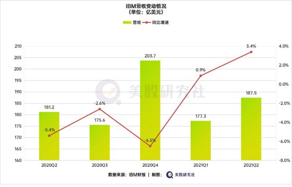 2021年第二季度,IBM总营收从去年的同比增加3.4%至187.5亿美元,高于市场预估的182.6亿美元,IBM盘后股价上涨3.68%。当然,IBM曾在2020年Q4表示今年将恢复增长,现在,至少投资者已经看到了希望的曙光。