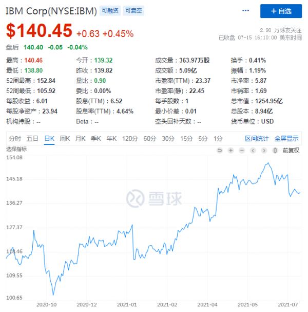 在业绩发布之前,2021年上半年,IBM股价已经跳涨17%,并在6月10日达到52周最高点152.84美元,回顾上一次闯过150美元大关,已经是2017年2月。