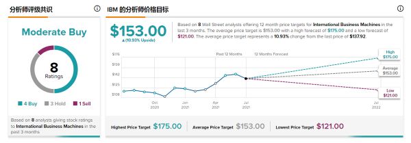 目前,分析师们对IBM的看好毫不掩饰,摩根士丹利的Kathryn Huberty重申了持有评级,目标价为152美元,过去12个月,覆盖IBM的八位分析师平均目标股价为153美元,尽管IBM已经数年没有达到过这个成绩。