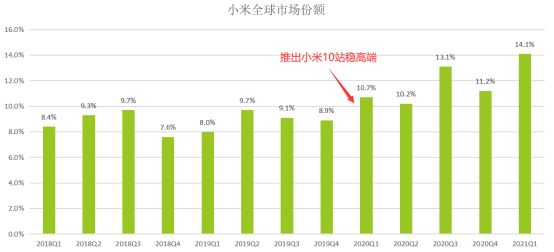 正是稳扎稳打的作风,让其能够在突然的疫情之下,依然有余力推出行业内首款5G旗舰机型小米10,从而站稳高端市场。根据IDC数据,在2020Q1季度推出小米10后,小米全球市场份额突然增长,并由此开始不断鲸吞其他厂家的份额。