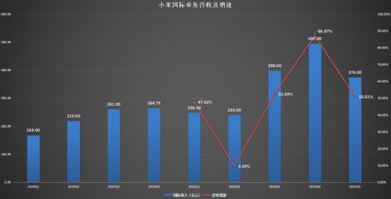 根据2021年Q1财报,小米海外市场单季营收达374亿元,同比增长50.6%,占公司总营收的48.6%。