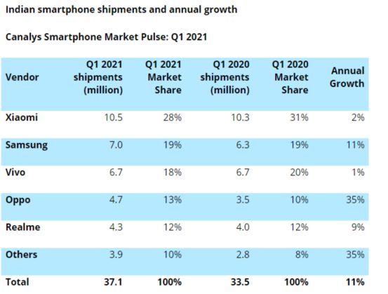 尤其是印度市场,小米延续了之前的强势地位,连续14个季度维持榜首,并以28%的市场份额稳坐头把交椅,领先第二名三星9个百分点。