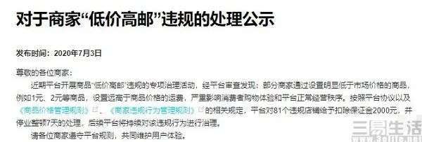 但就在一年前,抖音方面对于“一元秒杀”却可谓是深恶痛绝。去年7月3日,抖音小店发布了《对于商家“低价高邮”违规的处理公示》,其中表示部分商家通过设置明显低于市场价格的商品,例如1元、2元等商品设置远高于商品价格的运费,严重影响了消费者购物体验和平台正常经营秩序。